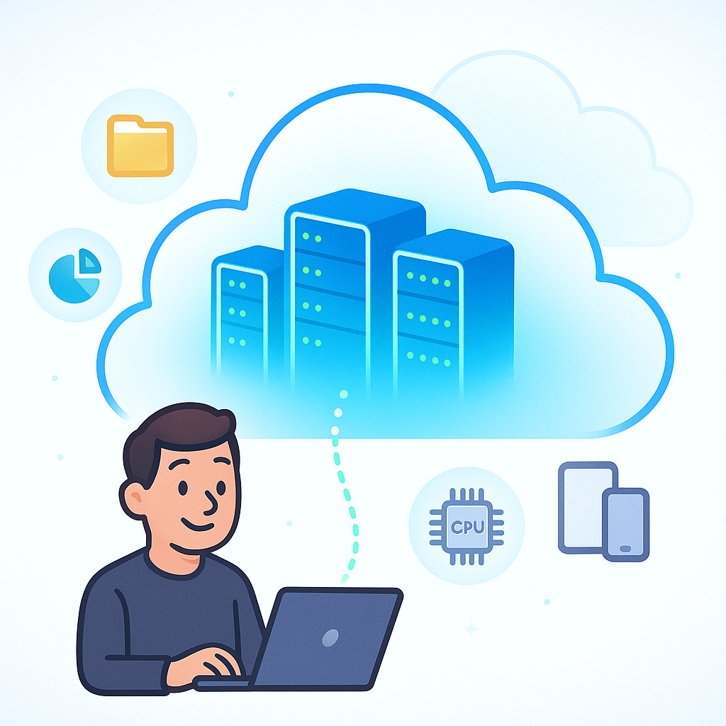 In simple terms, cloud computing means using remote servers on the internet to store, manage, and process data instead of using your computer’s local storage. Think of it as “renting” computing power and storage from someone else. This is usually done by big tech companies like Amazon, Microsoft, or Google so you don’t have to own all the expensive hardware yourself.